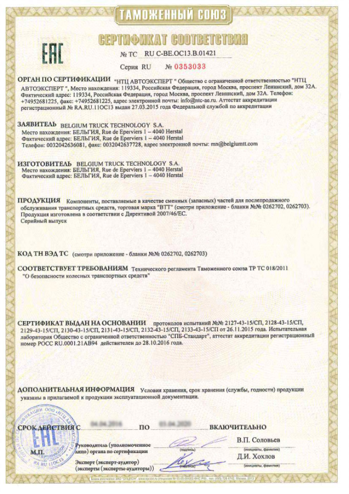 از تاریخ 1 ژانویه 2015، انطباق قطعات و مجموعه های خودرو می بایست منطبق با الزامات و مقررات فنی TR CU 018/2011 (ایمنی وسائل نقلیه) باشد و این قطعات قبل از عرضه در بازار روسیه و اتحادیه اوراسیا می بایست این الزامات را پاس نمایند. آیین نامه فنی تطابق استاندارد به دو شکل می باشد:
