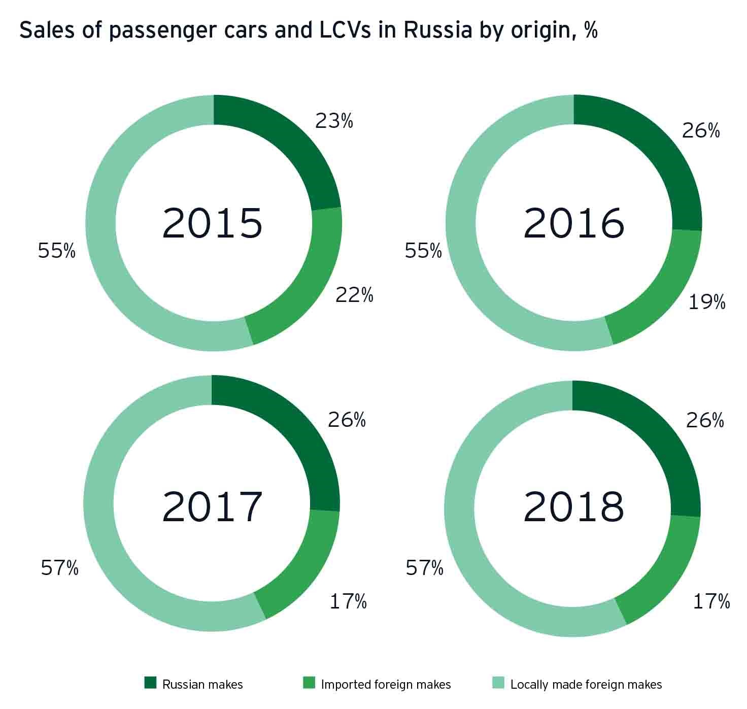 در سال 2019 در روسیه نرخ رشد فروش خودروهای سواری سبک تقریبا سه برابر نرخ رشد خودروهای تجاری سبک (LCV) بوده است (6/13 درصد در برابر 6/4 درصد) که نسبت به سال گذشته، 7 درصد کاهش را نشان می دهد. با توجه به وضعیت کلان اقتصاد، شرکت های کوچک و متوسط، نوسازی ناوگان حمل و نقل خود را به تعویق انداخته اند. همچنین افزایش هزینه های تامین مالی باعث شده تا در نیمه دوم سال 2018، فشار روی بازار افزایش قابل توجهی داشته باشد.
