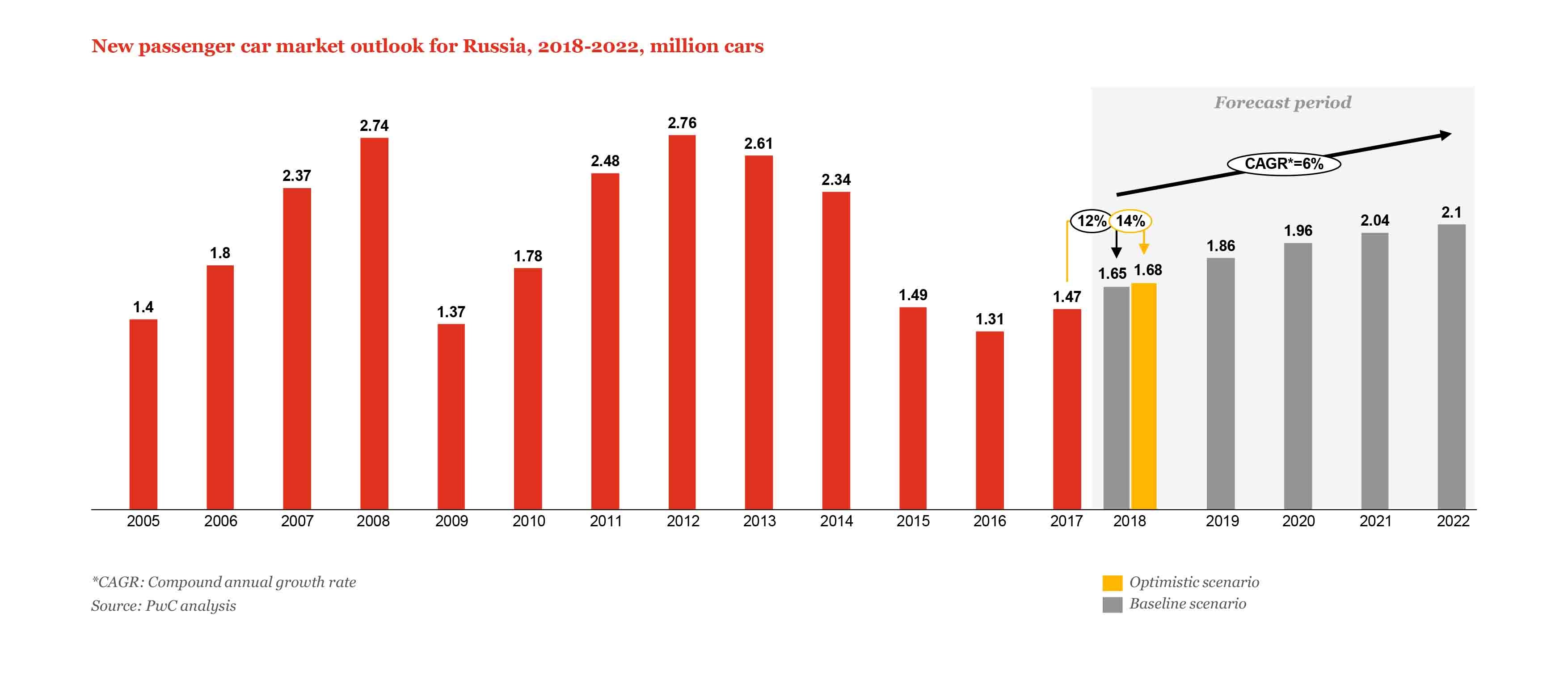 علیرغم رشد فروش خودروهای کلاس متوسط سواری سبک از 9500 به 146900 عدد، سهم این گروه از خودروها از فروش کل طی دو سال گذشته کاهش یافته و تمایل مردم روسیه به سمت خرید خودروهای ارزان تر تغییر کرده است. طی سال های 2017 و 2018 تولید خودرو و استفاده از ظرفیت های صنعت خودروسازی در کشور روسیه بدلیل تقاضای بالا افزایش یافته است. اتخاذ استراتژی صادراتی دولت روسیه یکی دیگر از عامل های افزایش میزان تولید طی این سال ها بوده است. در سال 2018 صادرات به میزان 11 درصد نسبت به سال پیش رشد کرده و به 4/3 میلیارد دلار رسیده است که این فراتر از اهداف تعیین شده می باشد. صادرات قطعات خودرو نیز به میزان 1/26 درصد رشد داشته است.